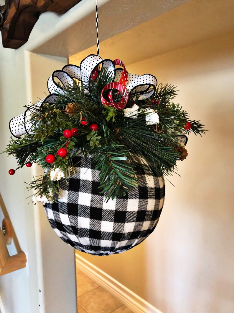 A kissing ball is the perfect start of a topiary creation, place the ball onto a dowel rod of your desired height then place into your favorite container. They hang by velvet ribbon strings. Pull the ribbon around to the top and tie it on in a secure knot. Made entirely of natural pine cones, pods, dried grasses and leaves. Hang it from the ceiling to make an affordable diy xmas decoration for your home, shop, restaurant, hotel or for a christmassy window display.